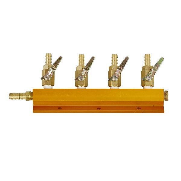 A 4-way horizontal gas manifold with a 3/8" inlet barb, and four 5/16" outlet barbs with shutoff valves on each so you can easily shut off the gas to each keg. Step up your kegging game with this bad boy that will allow you to have 4 kegs using a single source of gas, all at serving pressure and ready to drink. An essential tool for brewers out there with multiple kegs.